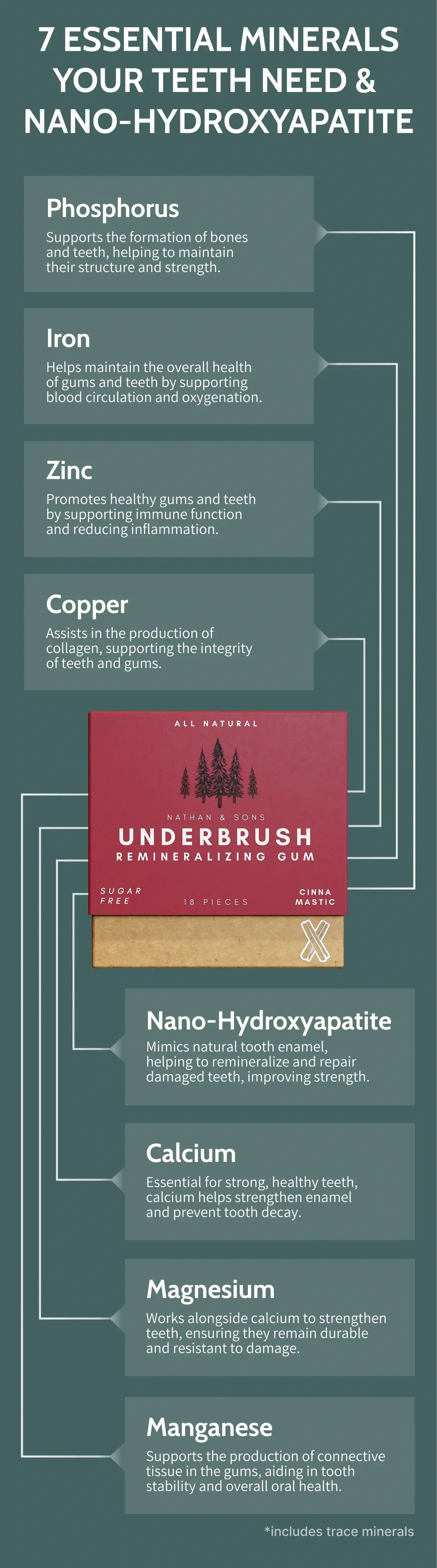 Our gum is packed with the vital minerals our teeth need to effectively remineralize and repair. In addition to phosphorus, iron, copper and zinc, our gum contains hydroxyapatite which is the same compound our teeth are made of. This combination of minerals helps to rebuild tooth enamel and combat decay.